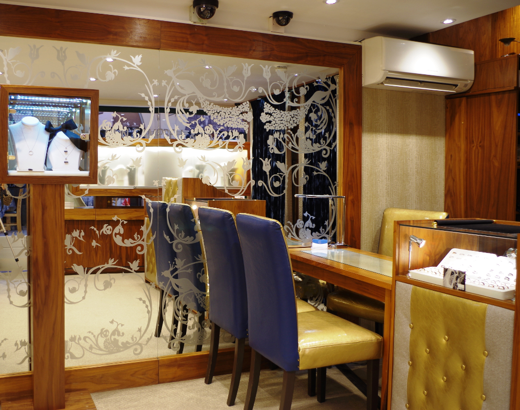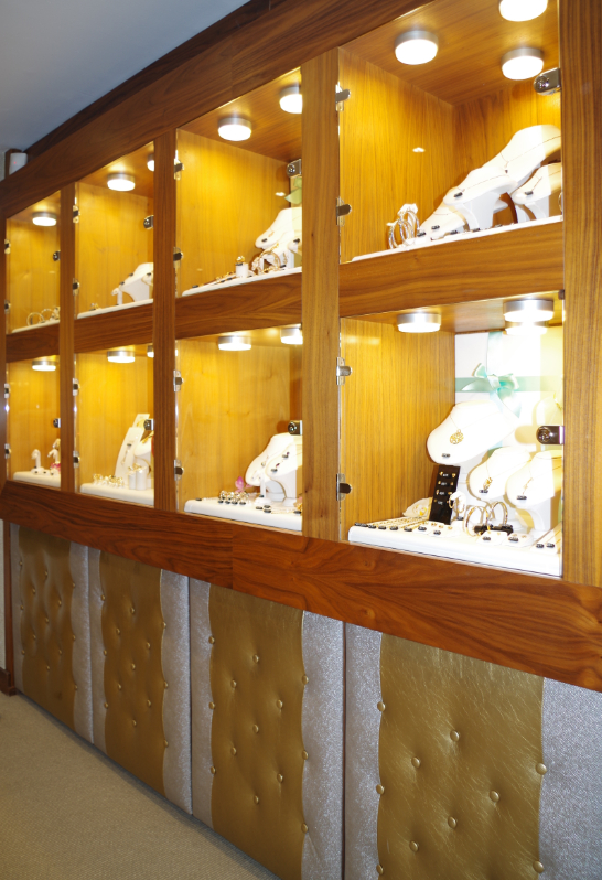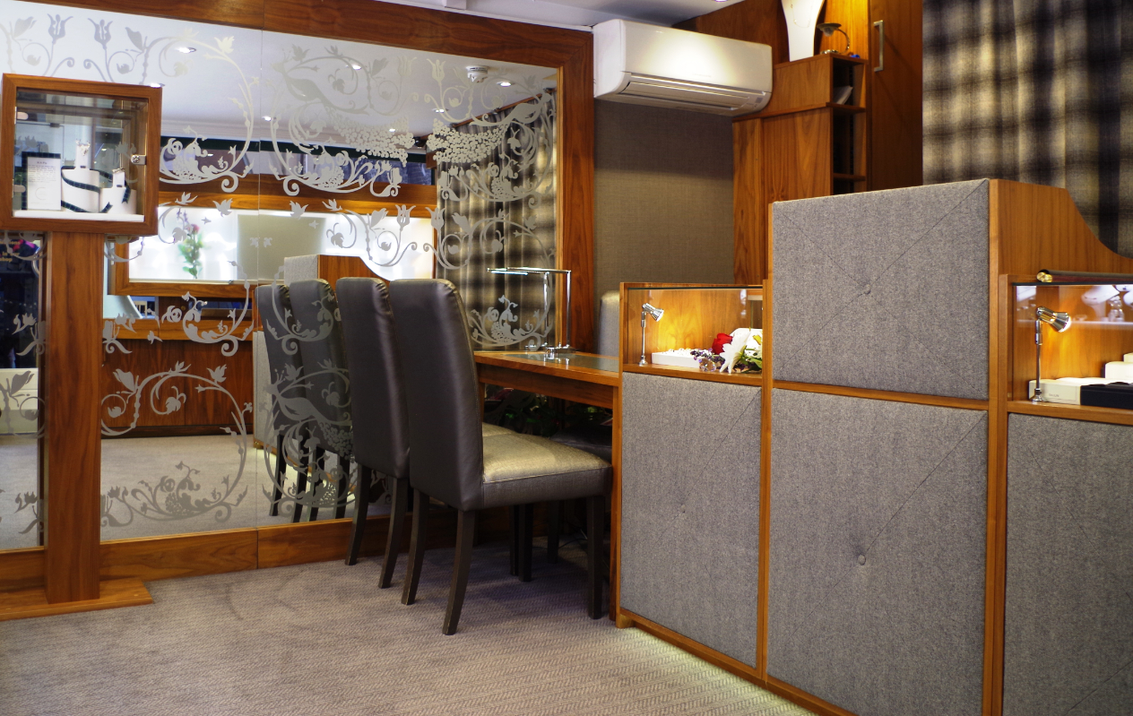 Rona Douglas Interiors designed a scheme to promote the luxurious feel of the jewellery by using golds and silvers, with glass beaded wallpaper, gold mosaics, crushed velvet and a custom designed artwork to transform the floor to ceiling mirror.