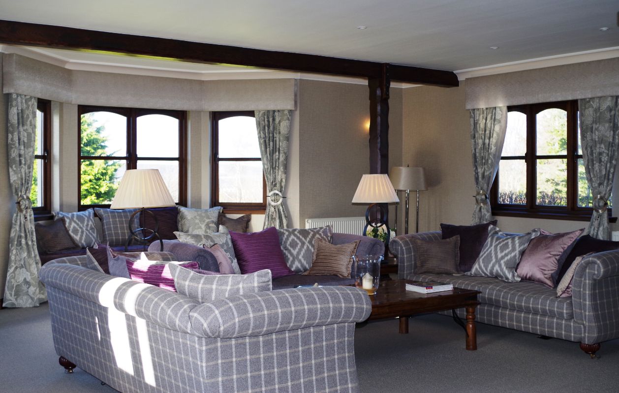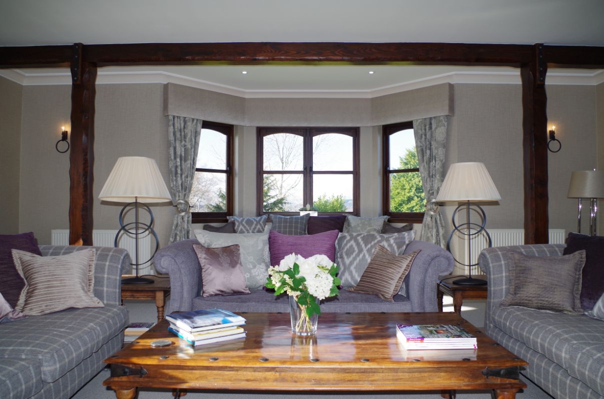 Rona Douglas Interiors were asked to create an interior scheme for this spacious lounge and dining area. The main challenge of this space was it’s scale and the incorporation of the existing statement fireplace, beams and columns into the scheme.