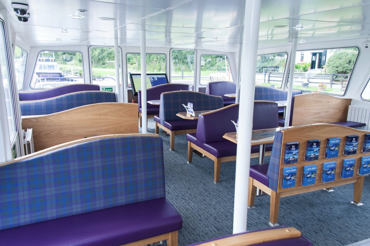 One of the main requirements of the design brief was to provide comfortable, good quality and stylish interiors, with an aesthetic more associated with bars and hotels, than boats. The corporate colours were a key issue with purple, blue and silver being used throughout the interior schemes. A corporate plaid was also commissioned with Rona Douglas Interiors working closely with the client and manufacturer to achieve a unique design which is used throughout the interiors of the boats.