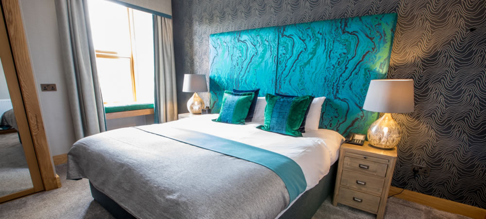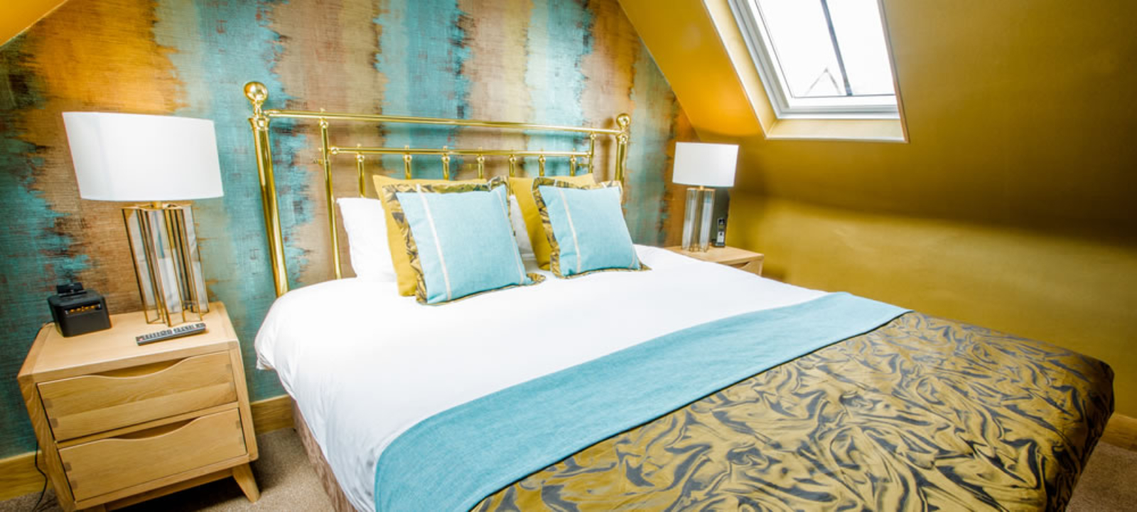 The brief was to create interiors which were very much on trend, and would wear well in this busy city hotel. Two luxurious schemes were created with the use of a huge upholstered headboard, large skylight windows, feature wallpapers, and sumptuous fabrics.